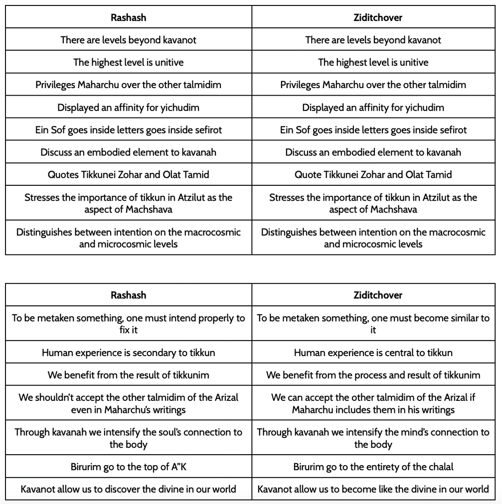 When comparing the Ziditchover’s and Rashash’s approaches to kavvanot, we find many important similarities. These include quoting shared source material, relevant historical leanings or beliefs related to kavvanot, and more. At the same time, we see important differences in the mechanics of the kavvanot and their results. It would be accurate to characterize the similarities as more theoretical beliefs about kavvanot and the differences as pertaining to practical elements. The first chart shows the similarities and the second chart shows the differences.