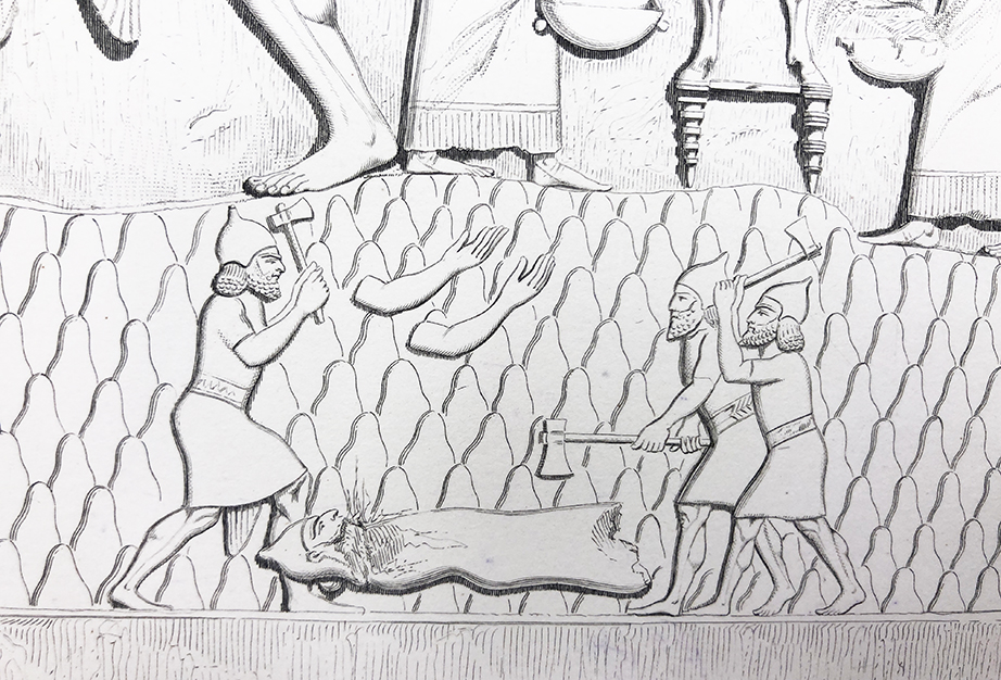 The project started when I recognized a parallel between one moment in the Mosul Museum video and a section of an ancient relief sculpture from Sargon II’s palace at Khorsabad. Both show three men with sledgehammers smashing the sculpture of a king. The resemblance is truly uncanny.