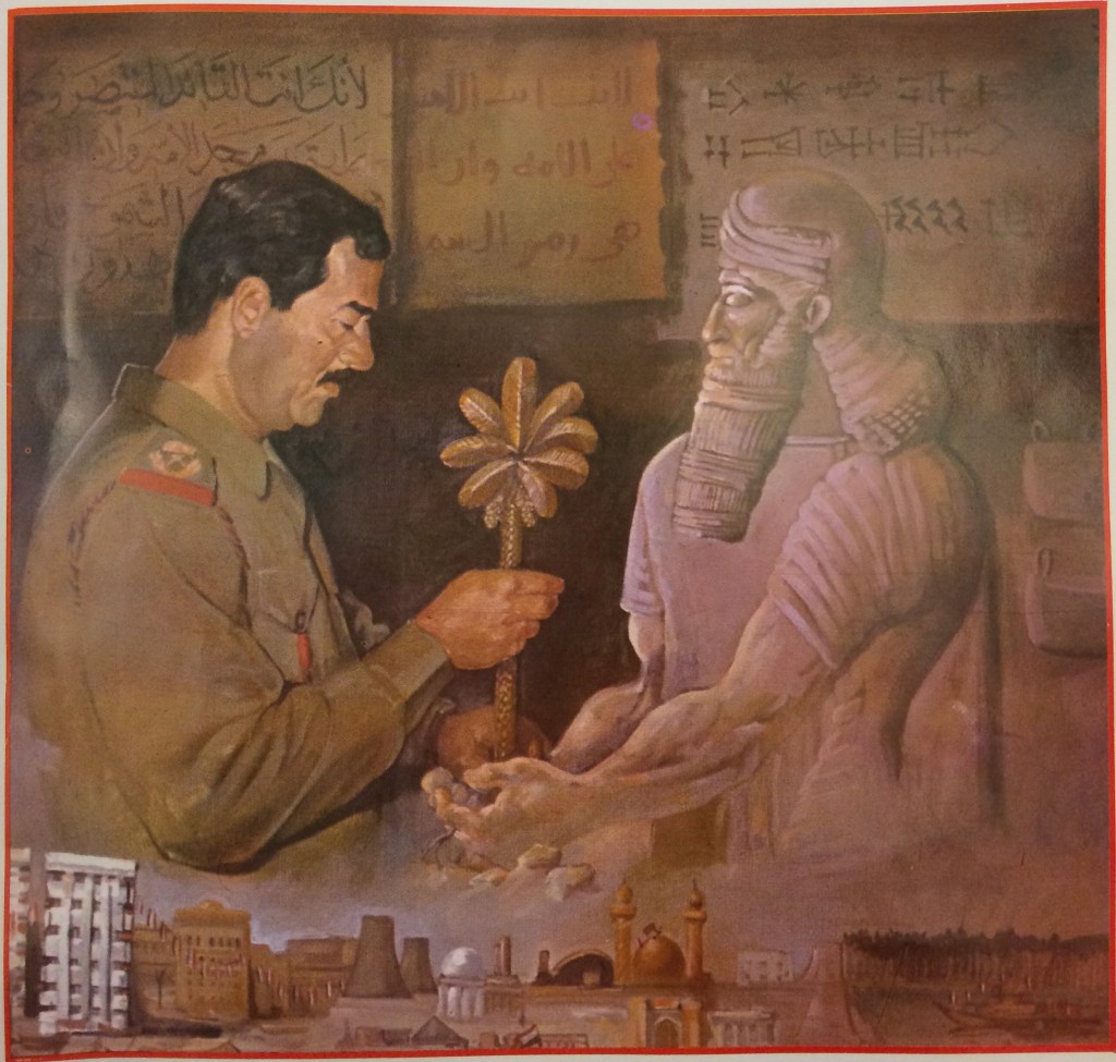 Saddam Hussein was particularly active in producing images that linked him to Iraq’s ancient past. When he wanted to be seen as leader of the Palestinian cause, he took on the guise of Nebuchadnezzar—the Babylonian king who sacked Jerusalem. During the Iran-Iraq War, he associated himself with ancient kings who withstood the Elamites. One image shows Saddam receiving Iraq’s heritage (in the form of a palm sapling) from an ancient Assyrian deity. Details emphasize the continuity of Iraq’s culture, from cuneiform antiquity through medieval Islam to today.